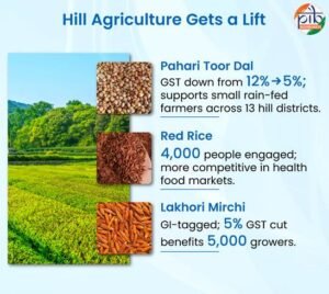 पहाड़ी तूर दाल, लाल चावल और लखौरी मिर्च पर जीएसटी घटाकर 5% करने से पहाड़ी उत्पादों को बढ़ावा मिला है, जिससे 13 पहाड़ी जिलों के छोटे किसानों को मदद मिली...