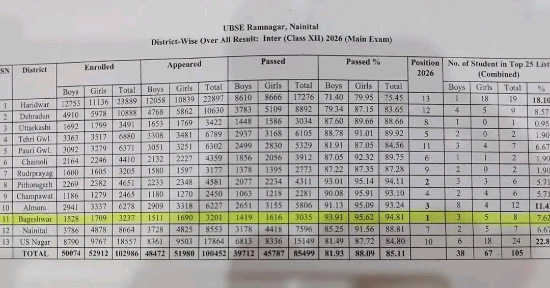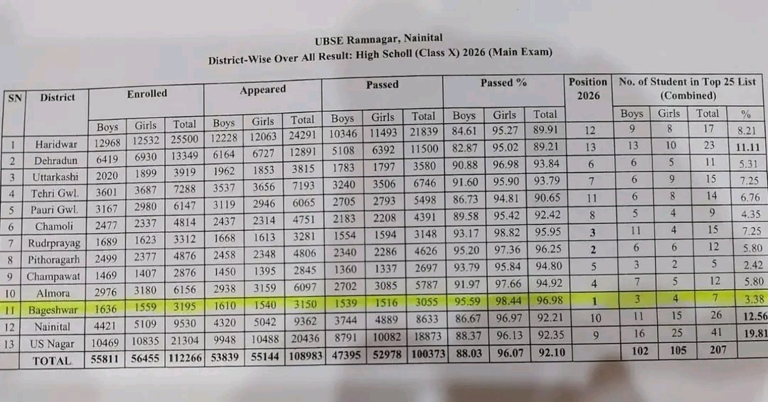 देहरादून : वर्ष 2026 की परिषदीय परीक्षाओं में जनपद बागेश्वर ने उत्कृष्ट प्रदर्शन करते हुए प्रदेश स्तर पर शीर्ष स्थान प्राप्त कर एक गौरवपूर्ण उपलब्धि हासिल की है। यह सफलता जनपद के शिक्षकों के समर्पण, विद्यार्थियों की मेहनत एवं अभिभावकों के सहयोग का परिणाम है।