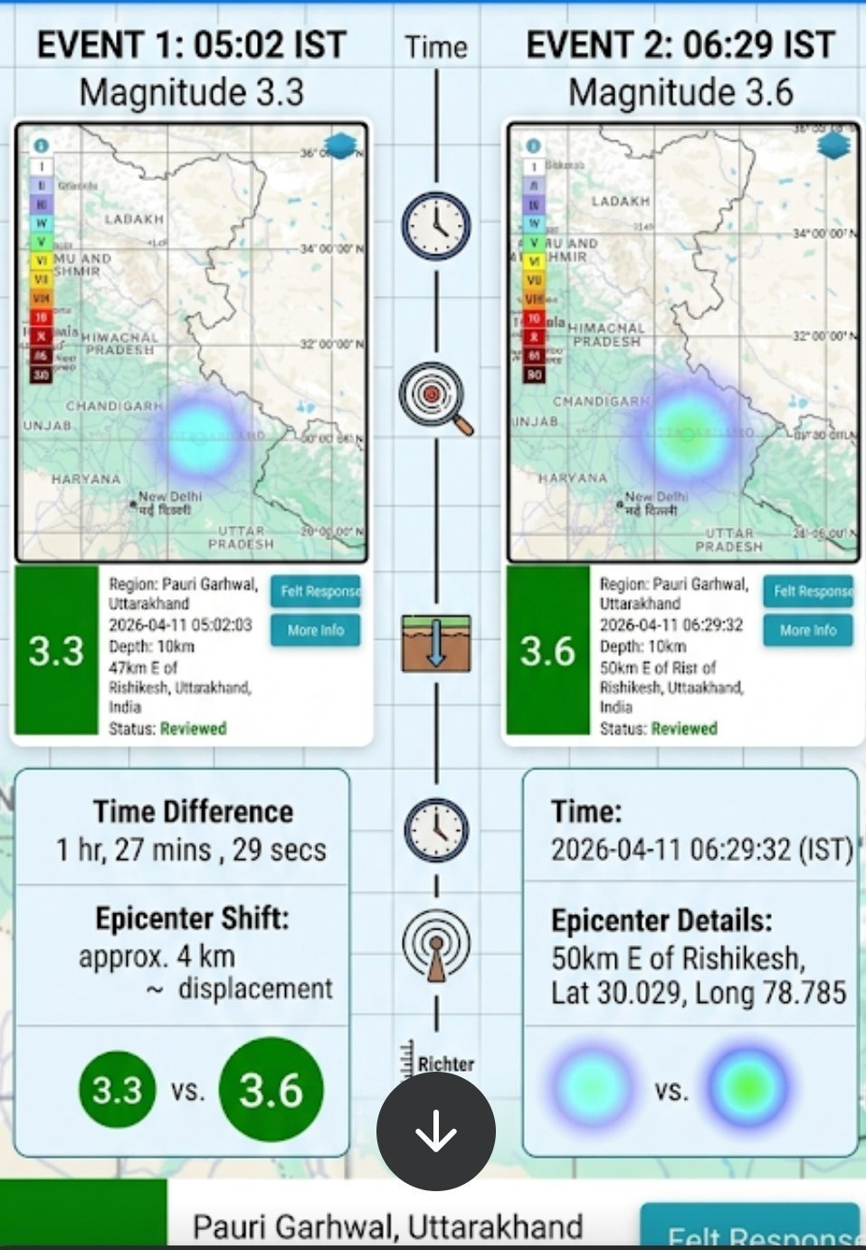 पहला भूकंप सुबह 05:02 बजे दर्ज किया गया, जिसकी तीव्रता 3.3 मापी गई। इसका केंद्र 30.007 अक्षांश और 78.751 देशांतर पर, करीब 10 किलोमीटर की गहराई में स्थित था। इसके बाद दूसरा झटका सुबह 06:29 बजे आया, जिसकी तीव्रता 3.6 दर्ज की गई। इसका केंद्र 30.029 अक्षांश और 78.785 देशांतर पर, लगभग 10 किलोमीटर की गहराई में रहा।