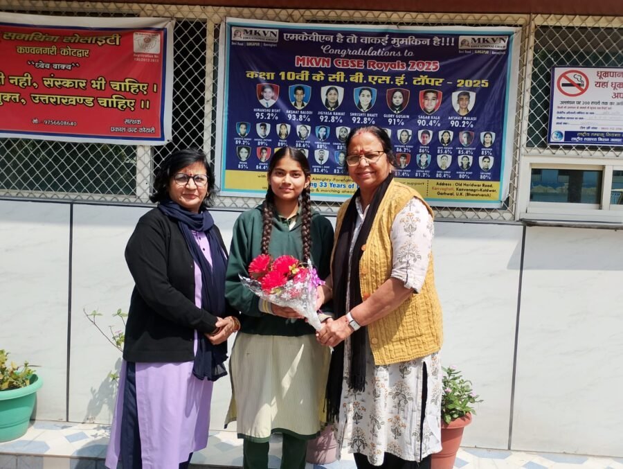 कोटद्वार : एमकेवीएन सीनियर सेकेण्डरी स्कूल कण्वघाटी की कक्षा-12वीं की छात्रा तराना रावत ने 26वीं यूथ नेशनल वाॅलीबाॅल चैंपियनशिप-2026 में उत्तराखण्ड की टीम का प्रतिनिधित्व करते हुए अपना उत्कृष्ट प्रदर्शन करके अपने माता-पिता तथा विद्यालय का नाम रोशन किया। यह राष्ट्रीय प्रतियोगिता 15 से 20 मार्च 2026 तक बिजू पटनायक स्टेडियम किट यूनिर्वसिटी ओडिशा में वाॅलीबाॅल फेडरेशन ऑफ इण्डिया के तत्वाधान में आयोजित किया गया। तराना रावत का राष्ट्रीय स्तर पर सहभागिता विद्यालय एंव छात्रा दोनों के लिए गर्व का विषय है। उनके अच्छे प्रदर्शन हेतु विद्यालय पहुँचने पर उनका भव्य रूप से स्वागत तथा सम्मान किया गया। विद्यालय के प्रबंध निदेशक प्रकाश चन्द्र कोठारी, शिक्षा निदेशिका सिन्धु कोठारी एवं प्रशासनिक निदेशक विपिन जदली द्वारा तराना रावत को पुष्प गुच्छ एंव मेडल देकर सम्मानित किया गया।