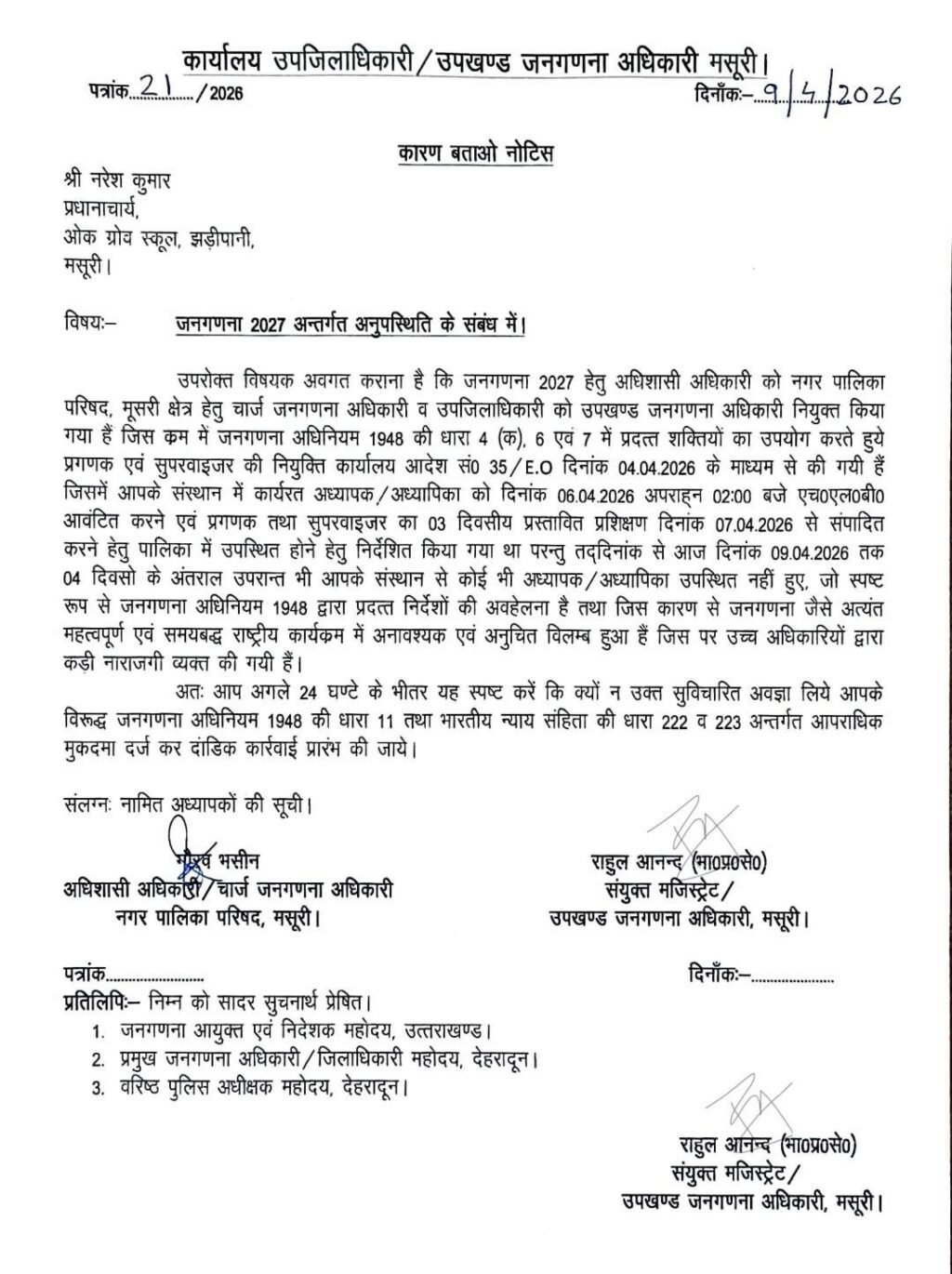 मसूरी। जनगणना 2027 के तहत आयोजित प्रगणक एवं सुपरवाइजर प्रशिक्षण में अनुपस्थिति को गंभीरता से लेते हुए मसूरी प्रशासन ने सख्त रुख अपनाया है। उपजिलाधिकारी एवं उपखंड जनगणना अधिकारी, मसूरी द्वारा ओक ग्रोव स्कूल, झड़ीपानी के प्रधानाचार्य नरेश कुमार को कारण बताओ नोटिस जारी किया गया है।