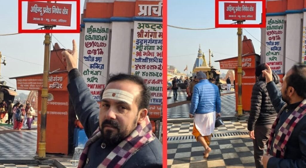 हरिद्वार: धर्मनगरी हरिद्वार के विश्व प्रसिद्ध हर की पैड़ी क्षेत्र में अहिंदुओं के प्रवेश पर रोक लगाने के पोस्टर लगाए गए हैं। ये पोस्टर श्री गंगा सभा की ओर से लगाए गए हैं, जिसमें स्पष्ट रूप से लिखा है कि “अहिंदुओं का प्रवेश निषेध है”। पोस्टरों में 1916 के हरिद्वार म्युनिसिपल बायलॉज का हवाला देते हुए कहा गया है कि यह क्षेत्र उस कानूनी प्रावधान के अंतर्गत आता है, जिसके तहत गैर-हिंदुओं का प्रवेश वर्जित है।