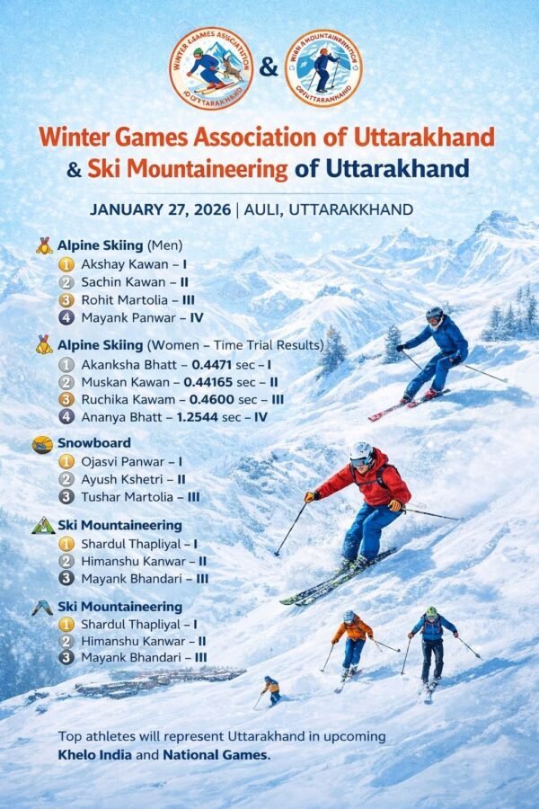 ​औली/चमोली । विश्व प्रसिद्ध हिमक्रीड़ा स्थल औली के मखमली बर्फीले ढलानों पर मंगलवार को विंटर गेम्स एसोसिएशन ऑफ उत्तराखंड के तत्वावधान में स्की, स्नोबोर्ड और स्की माउंटेनियरिंग टीम के खिलाड़ियों के लिए चयन ट्रायल का सफल आयोजन किया गया। आगामी ‘खेलो इंडिया’ और ‘नेशनल गेम्स’ की तैयारियों के दृष्टिगत आयोजित इस ट्रायल में प्रदेश भर के पुरुष एवं महिला वर्ग के खिलाड़ियों ने उत्साहपूर्वक प्रतिभाग किया। चयन प्रक्रिया को पारदर्शी बनाने के लिए खिलाड़ियों का ‘टाइम ट्रायल’ लिया गया, जिसके आधार पर अंतिम रैंकिंग निर्धारित की गई। इस दौरान खिलाड़ियों के अंतरराष्ट्रीय अनुभव को भी ध्यान में रखा गया, ताकि आगामी राष्ट्रीय प्रतियोगिताओं में उत्तराखंड का प्रतिनिधित्व मजबूत हो सके।
